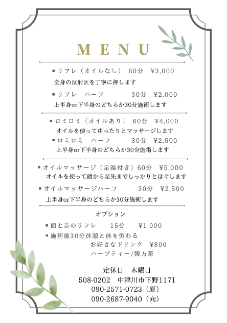 また、つらい肩こりなどには、肩と首のリフレクソロジーがお勧めです。肩がかるーくなりますよ。緑香庵での安らぎの時間をあなたに。