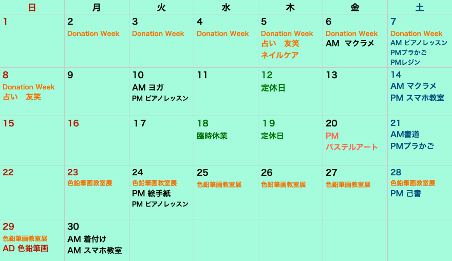 上記は、クラス&イベントのみのスケジュールとなります。リフレ、スペースレンタル又はランチご予約の方は直接ご連絡下さい。