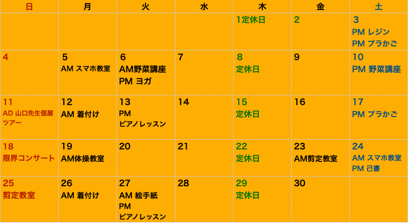 下記は、クラスのみのスケジュールとなります。スペースレンタル又はランチご予約の方は直接ご連絡下さい