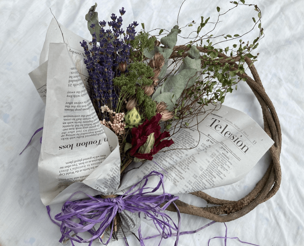 ラベンダーをメインに、ご自分で選んだドライフラワーでスワッグを作り