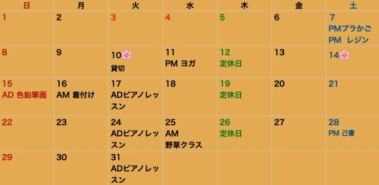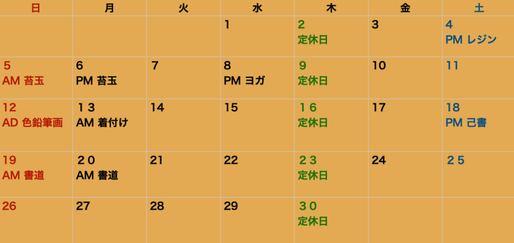 下記は、クラスのみのスケジュールとなります。スペースレンタル又はランチご予約の方は直接ご連絡下さい
